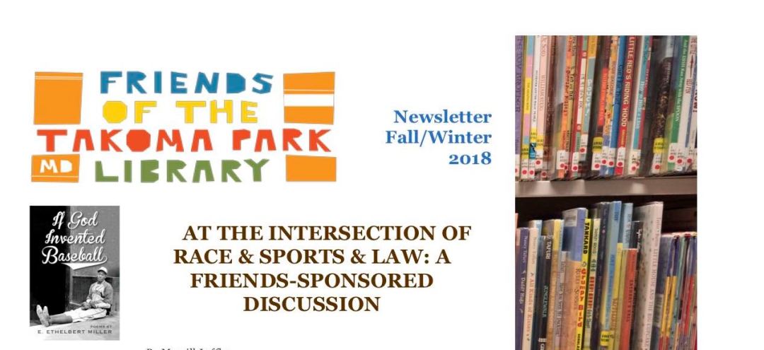 The Friends of the Takoma Park Maryland Library fall 2018 newsletter will soon be in the mailboxes of members. In this issue, there is an article on the upcoming special event, co-sponsored with the City of Takoma Park, on Race, Sports, and Law and, looking back at our summer activities, there is a report on some of the programs sponsored by the Friends to encourage children to read. There are short articles about upcoming events for children and adults.