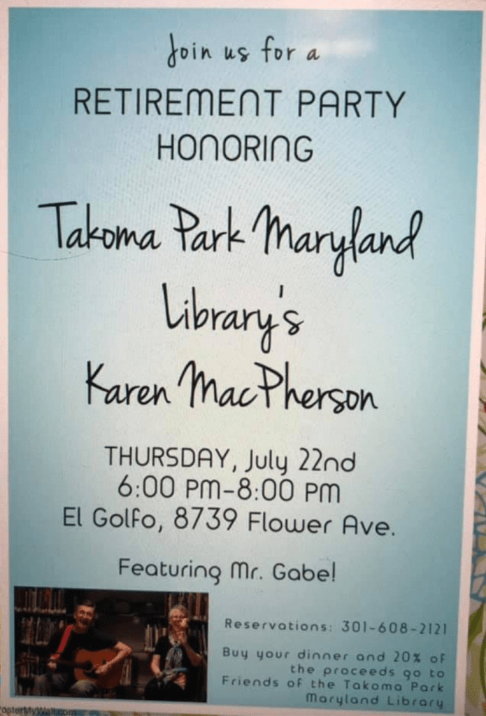El Golfo restaurant is hosting a party for the library’s recently-retired Karen MacPherson. The party will take place on Thursday, July 22nd, from 6:00 to 8:00 p.m. A percentage of your dinner purchase will be donated to benefit the Friends of the Takoma Park Maryland Library. For details, click on the title of this post to see the flyer.
