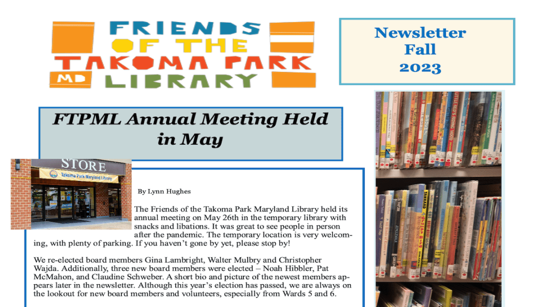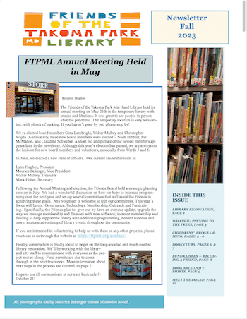 The fall 2023 newsletter is out. In it, you’ll find articles on our annual meeting held in May; status of library renovation; what will happen to the trees on the library lawn; news on children’s programs; recent author events at the library; news from the Friends Book Group; membership fundraising; an announcement about our upcoming fall book sale; and profiles of our new board members. To get the newsletter, click on the image below.