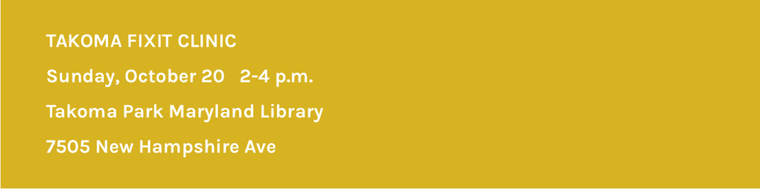 In cooperation with the Takoma Park Library, the Friends of the Takoma Park Library is sponsoring its next Fixit Clinic Fixit Clinic on October 20, from 2:00 p.m. to 4:00 p.m. at the temporary location of the library, 7505 New Hampshire Ave.