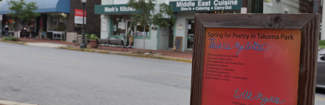 Since 2007, Takoma Park has welcomed spring with colorful poetry posters along Carroll Avenue, from the Junction to Old Town, in city parks, and at the Library and Community Center.